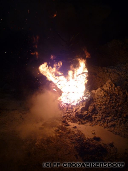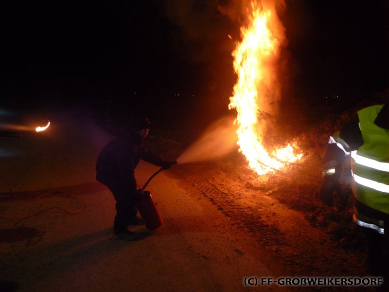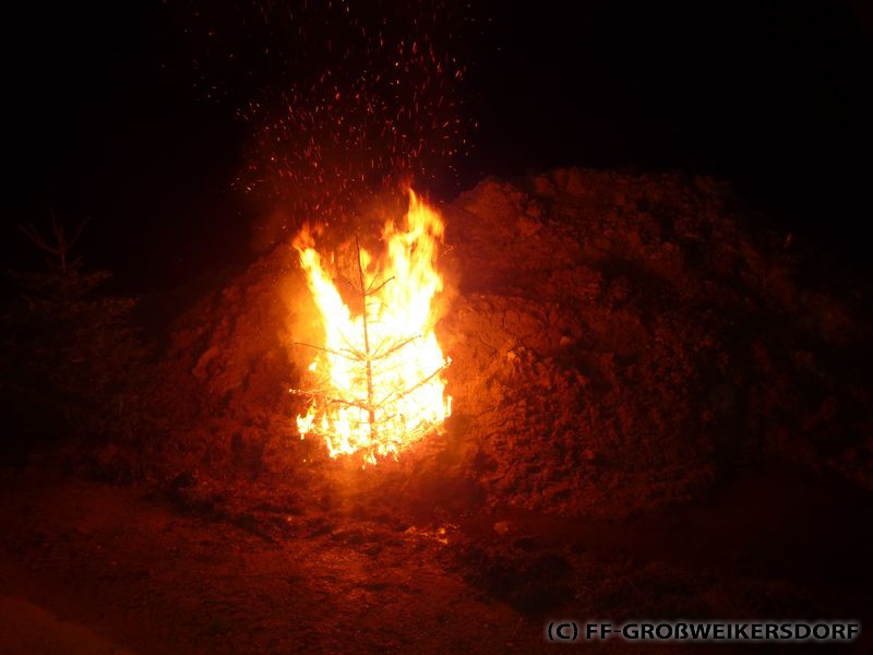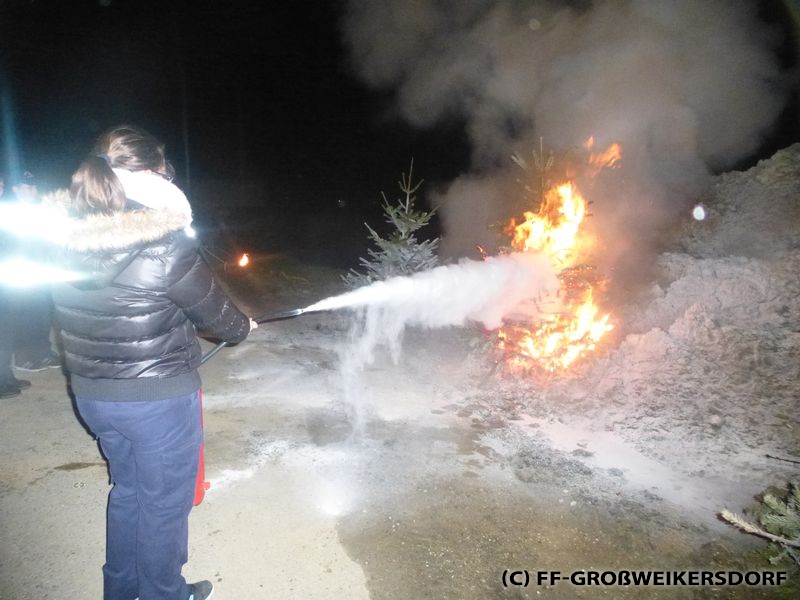 Anschließend wurde demonstriert, wie schnell ein ausgetrockneter Christbaum in Flammen aufgehen kann. Zahlreiche Bäume wurden entzündet, welche innerhalb weniger Sekunden (!) in Vollbrand standen. Ein solches Feuer lassen die Jung-Floriani‘s jedoch nicht einfach unkontrolliert wüten. Mit ausgedienten Feuerlöschern wurden die Flammen bis zum Erlöschen bekämpft.