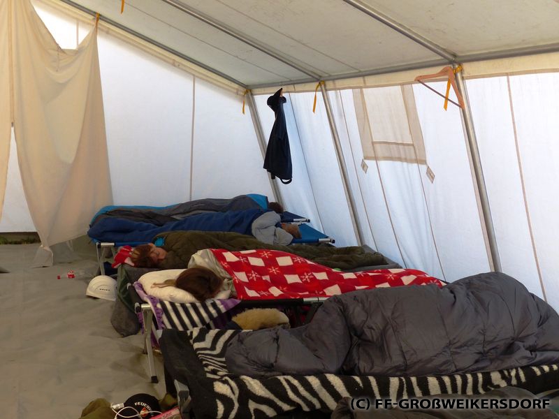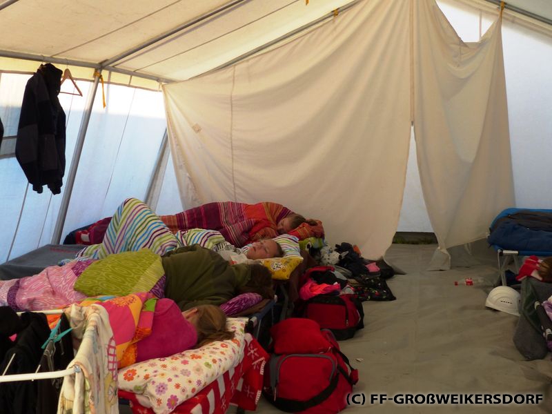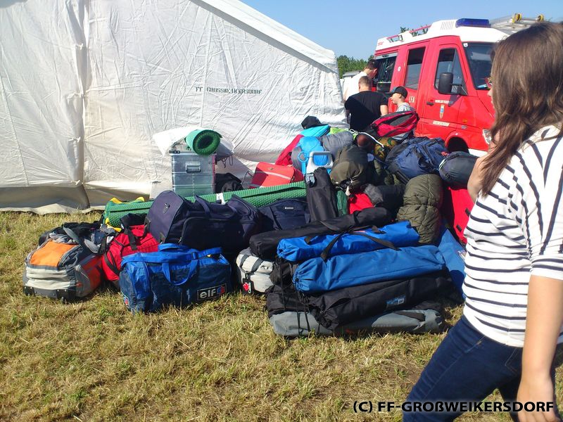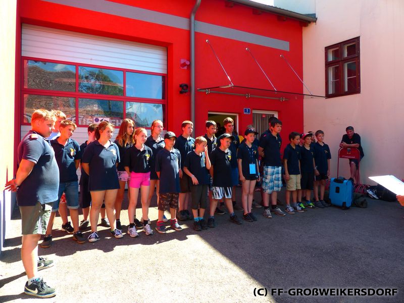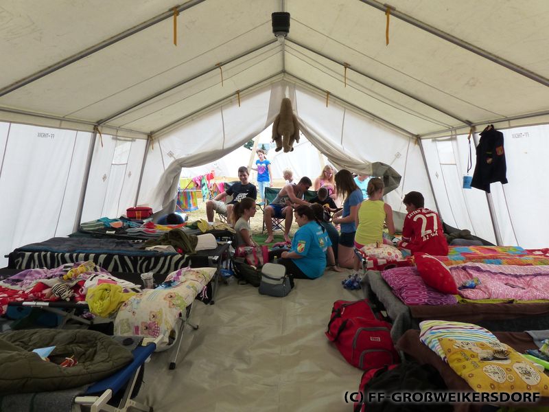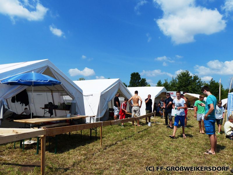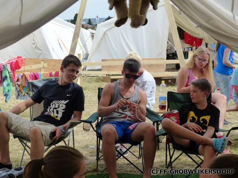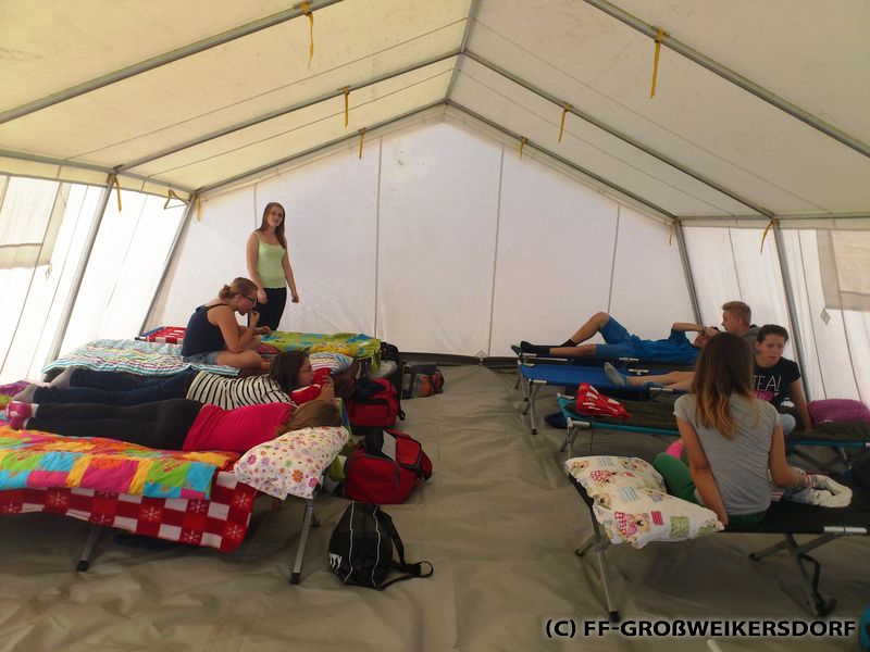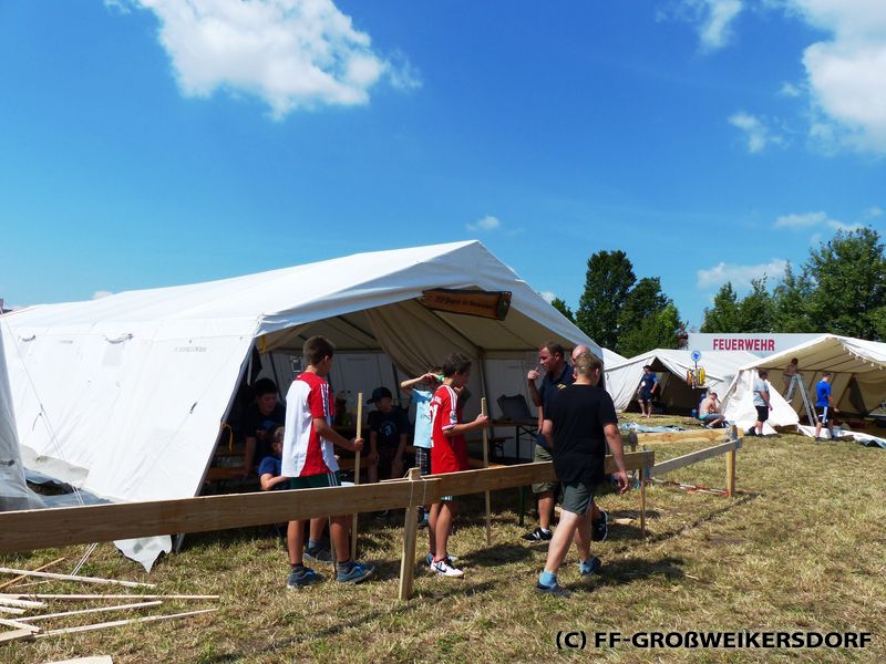 Schon am frühen Donnerstagmorgen traf man sich im Feuerwehrhaus mit den Jugendgruppen aus Thern und Neudegg, um gemeinsam auf das Lager zu fahren. Die drei Wehren stellten in enger Zusammenarbeit eine bezirksübergreifende Jugendbewerbsgruppe für die Disziplinen Bronze und Silber zusammen. Nach zirka einstündiger Anfahrt konnte bei strahlendem Sonnenschein und 30 Grad im Unterlager West mit dem Aufbau von 3 Zelten begonnen werden. Wie jedes Jahr wurde aus dem bereitgestellten Nutzholz ein Zaun bei den Zelteingängen errichtet.