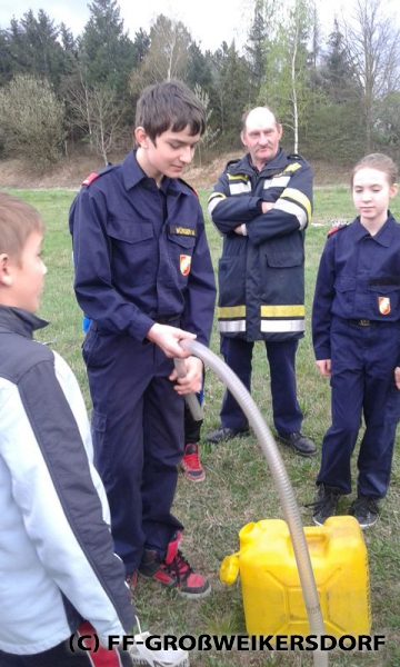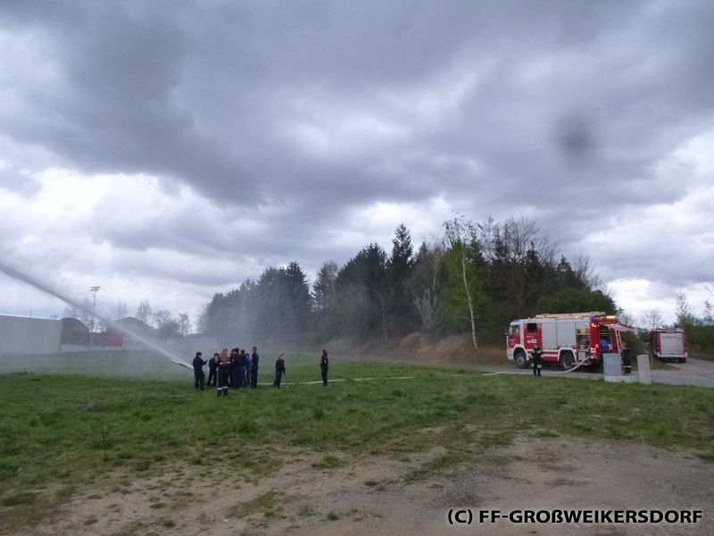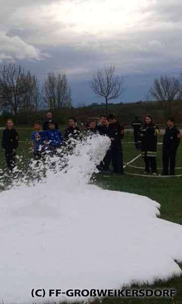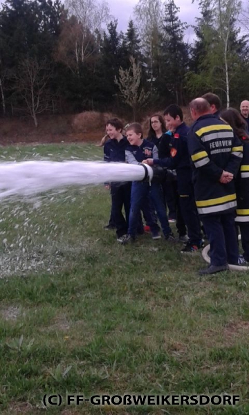 Am 25. März wurden diverse Wasserführende Armaturen vor dem Feuerwehrhaus im Selbststudium erforscht, und auch erste Löschangriffe mittels Löschleitung oder Kübelspritze wurden durchgeführt. Bereits eine Woche später brachen die Jugendlichem mit dem Rüstlöschfahrzeug zum Gemeindebauhof auf, um weitere Utensilien zu testen. Die Jung-Florianis durften am eigenen Leib erfahren, welchen Kraftaufwand es erfordert, das HD-Rohr der Schnellangriffseinrichtung festzuhalten, und auch die mittels Hydroschild erzeugte Wasserwand hatte staunende Gesichter zur Folge. Am dritten und letzten Übungsabend wurde vor dem Gemeindebauhof ein Schaumteppich erzeugt, welcher unverzüglich für eine wilde Schaumparty genutzt wurde. Zu guter Letzt hieß es „Löschen XXL“ mit dem Wasserwerfer des Rüstlöschfahrzeuges.