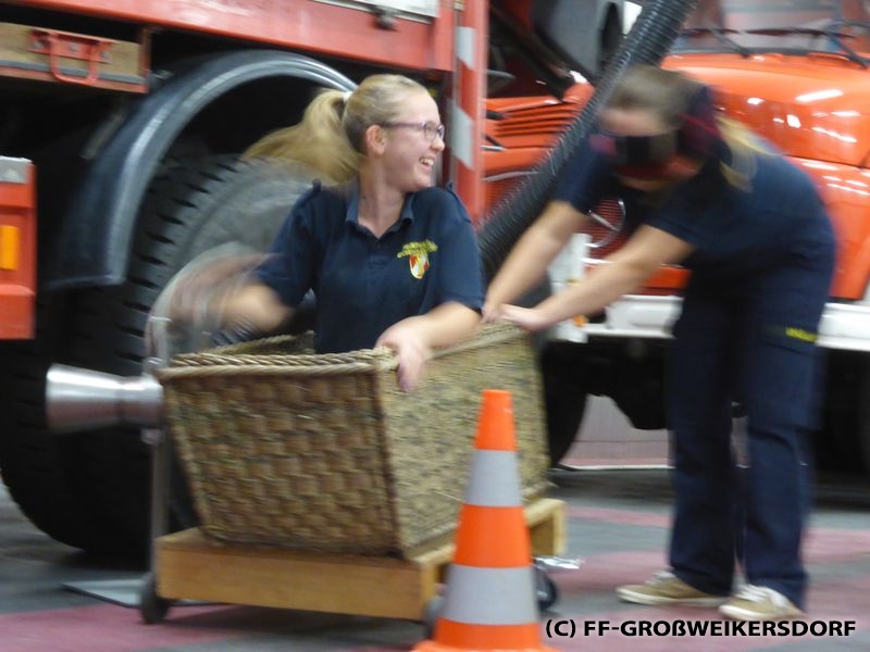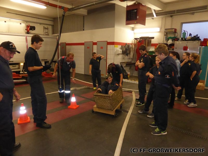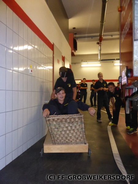 Bei einer Übung der spielerischen Art, konnten sich die Jugendlichen in einem improvisierten Sautrog beweisen - im Wettstreit gegen die Zeit. In Anlehnung an den Wasserdienst gab es im ersten Durchlauf einen Stock als Fahrbehelf.Anschließend musste ein aufgebauter Parcours in 2er-Trupps bewältigt werden. Um dies jedoch etwas zu erschweren, wurden immer einem der Kids die Augen verbunden. Dadurch wurde ersichtlich, wie wichtig die Kommunikation untereinander im Trupp ist - vergleichbar mit einem Atemschutztrupp im Innenangriff.
