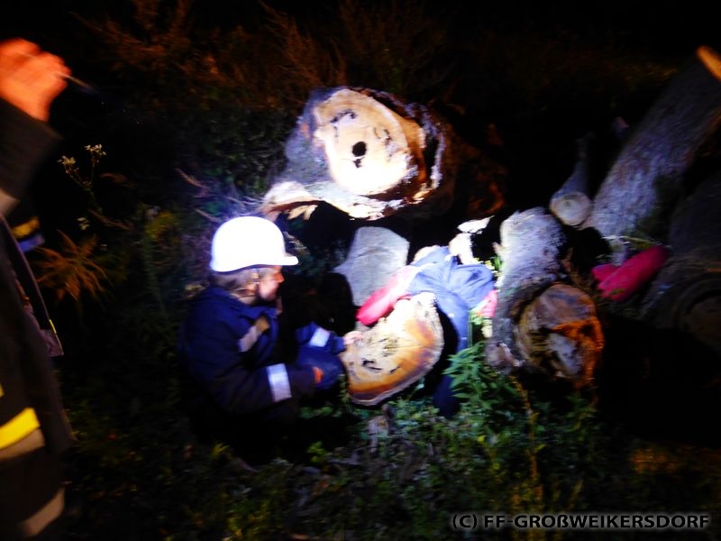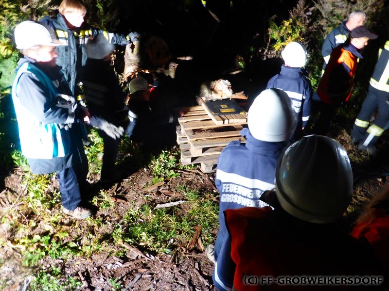 Person in Notlage. Bei einem Holzplatz ist eine Person zwischen Baumstämmen eingeklemmt. Dort angekommen mussten sich die Jugendlichen erstmal um die Lichtversorgung kümmern. Während die Einen für Licht sorgten, brachten die Anderen die Hebekissen in Stellung. Der Arbeiter konnte schnell aus der misslichen Lage befreit werden und die Feuerwehrjugend konnte ihre Nachtruhe fortsetzen.