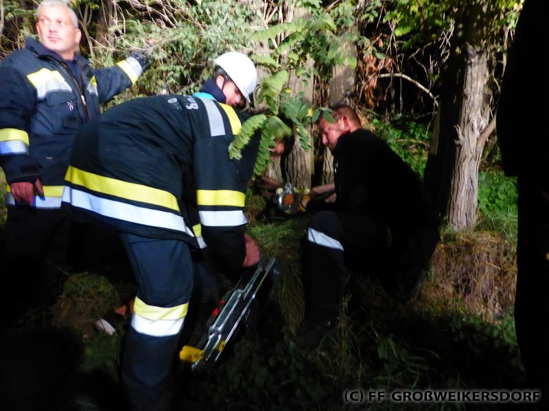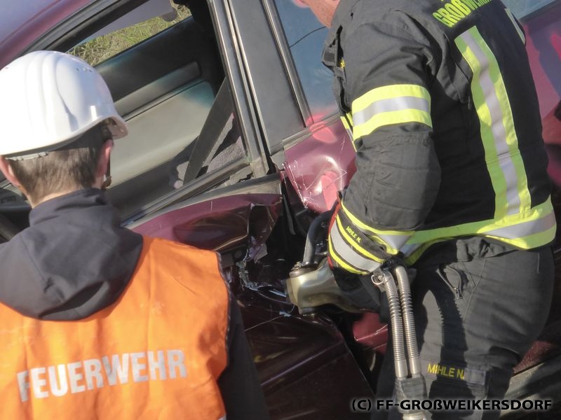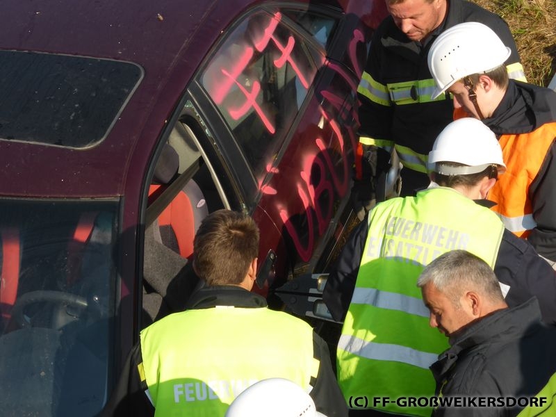 Im Industriegebiet hatte sich ein Verkehrsunfall ereignet, bei dem ein PKW in den Graben stürzte und der Fahrzeuglenker eingeklemmt wurde. Mittels Spreizer des hydraulischen Rettungssatzes wurde die Fahrertüre entfernt. Gleichzeitig wurde der verletzte Unfalllenker professionell betreut. Anschließend wurde er mit einem Spineboard aus dem Fahrzeug gebracht.