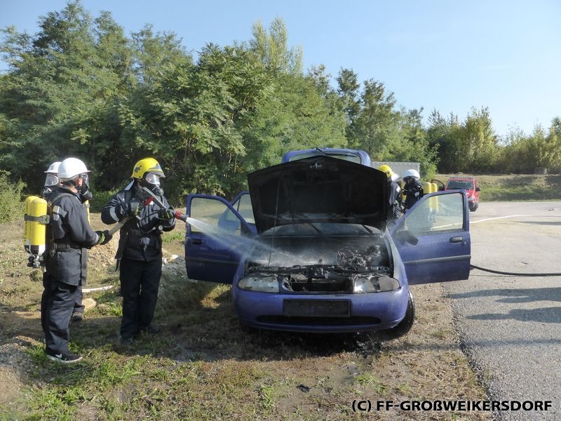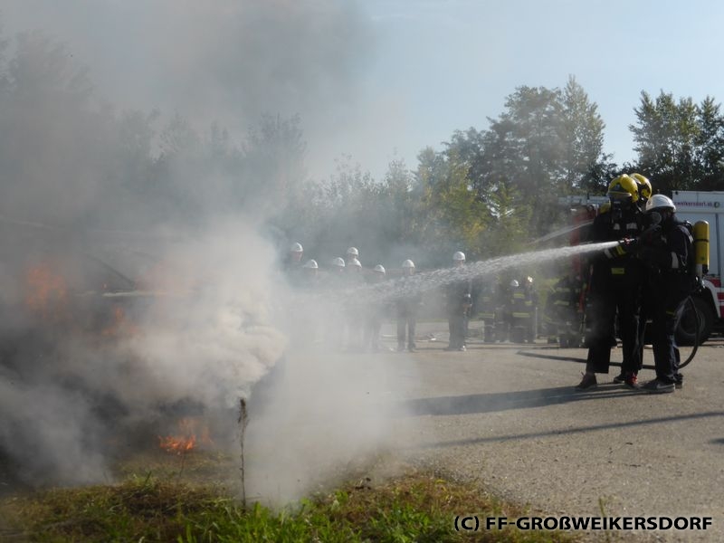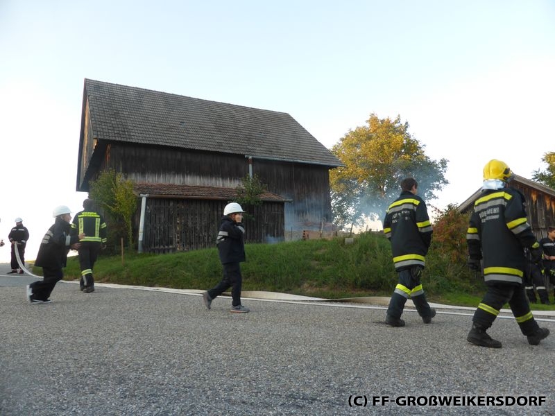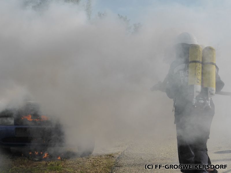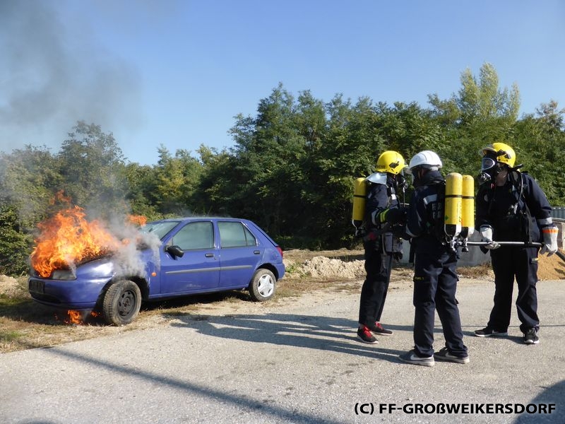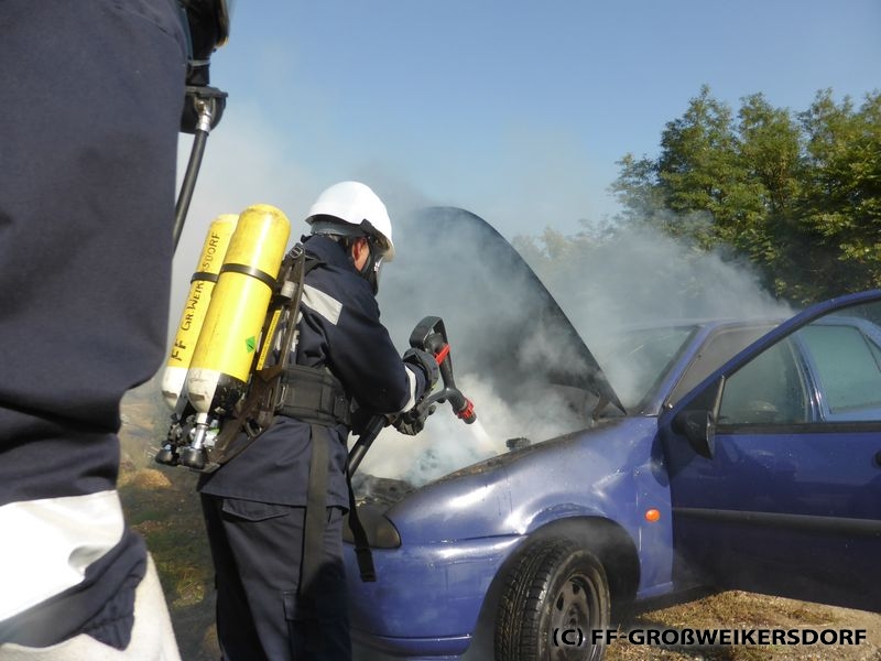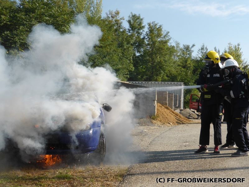 Ein auf dem Gemeindebauhof abgestelltes Fahrzeug war aufgrund eines technischen Defektes in Brand geraten. Die Jugendlichen eilten in die Einsatzfahrzeuge und rüsteten sich auf dem Weg zum Einsatzort mit den Atemschutzgeräten aus. Bereits während der Anfahrt zum Einsatzort war eine Meterhohe Rauchsäule zu sehen. Am Ort des Geschehens wurde durch einen Atemschutztrupp umgehend ein Löschangriff mittels Hochdruck-Schnellangriffseinrichtung gestartet, während ein weiterer Trupp eine Löschleitung mit einem weiteren HD-Rohr vorbereitete und ebenfalls mit dem löschen begann. Mit vereinten Kräften konnte das Feuer rasch unter Kontrolle gebracht werden. Abschließend wurden mittels Wärmebildkamera letzte Glutnester ausfindig gemacht.